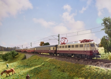 Vorbild: Einheits-Elektrolokomotive 114 502-8 der Deutschen Bundesbahn (DB) mit windschnittiger Front (Bügelfalte). Achsfolge Bo´Bo´. Baujahr ab 1963. Grundfarbgebung in purpurrot/elfenbein. Betriebszustand um 1988.Einsatz: Personenzüge im Nah- und Fernverkehr und gelegentlich auch Güterverkehr.