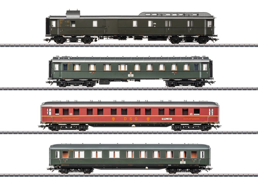 Vorbild: Schnellzugwagen-Set besteht aus den folgenden 4 Wagen unterschiedlicher Bauarten zum Schnellzug D 74. 1 vierachsiger Gepäck- und Postwagen PwPost4ü. 1 vierachsiger Sitzwagen ABC4ü, 1./2./3. Klasse (Einheitsbauart 1928-30). 1 vierachsiger Schürzen-Schlafwagen WLAB4ü(e) der DSG. 1 vierachsiger Schürzenwagen BC4üwe, 2./3. Klasse. Zuglauf: D 74 Hamburg Altona - Basel SBB, für den Streckenabschnitt Frankfurt-Basel SBB. Deutsche Bundesbahn (DB) und Deutsche Speisewagen- und Schlafwagen-Gesellschaft (DSG). Betriebszustand um 1955.