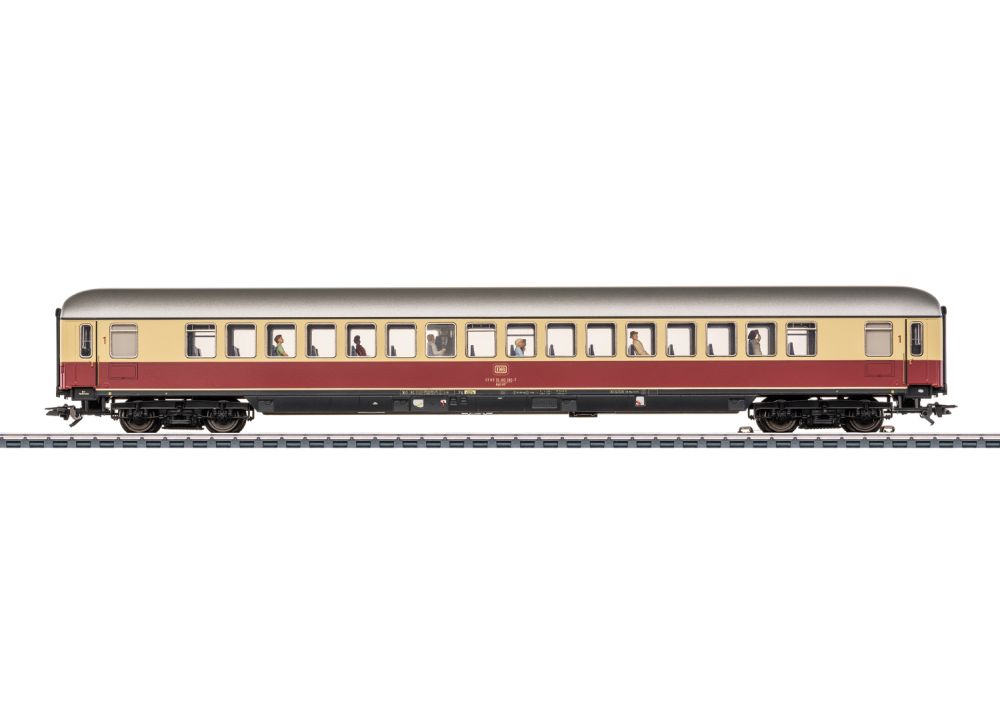 Modell: Mit Digital-Decoder mfx. Mit beweglicher, digital schaltbarer Schaffnerfigur im Mittelgang. Serienmäßig eingebaute LED-Innenbeleuchtung, trennbare stromführende Kupplungen und Zugschlussbeleuchtung am Wagenende 1 und 2 jeweils separat digital schaltbar. Beleuchtung mit wartungsfreien Leuchtdioden (LED). Mit Pufferspeicher. Schleifer ist montiert. Typspezifisch gestalteter Unterboden und Schürze. Mit Drehgestellen nach Bauart Minden-Deutz schwer, vorbildentsprechend mit Scheibenbremsen, Magnetschienenbremse und angesetzten Generatoren. Inneneinrichtung mit Figuren. Gesamtlänge über Puffer 28,2 cm.