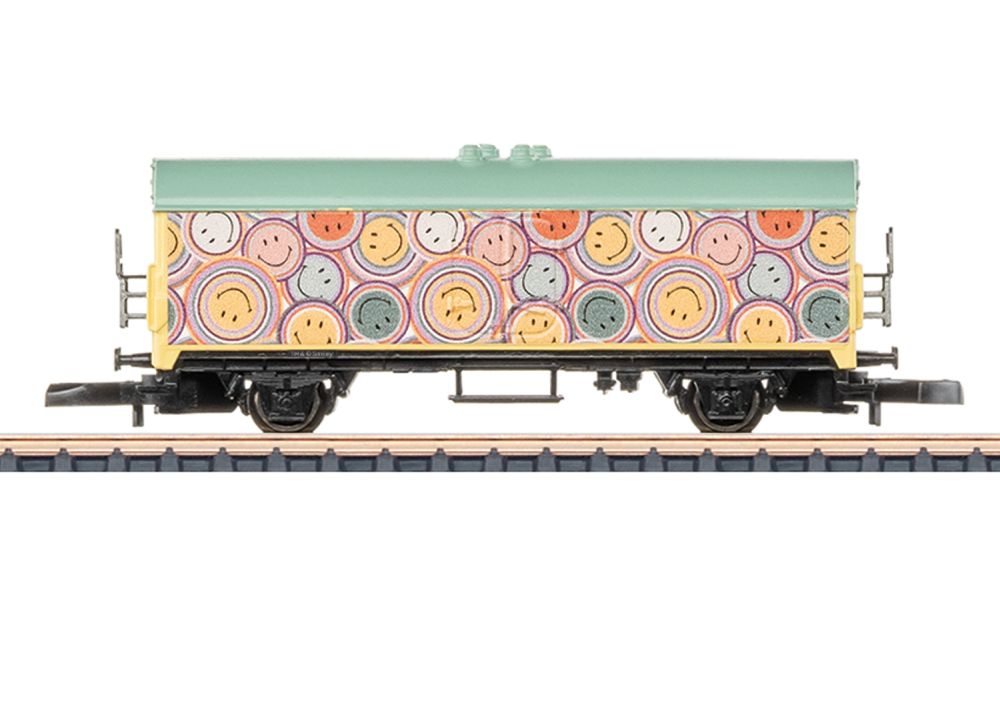 Modell: Zweite Auflage eines SmileyWorld® Wagen in Märklin Z. Aufwendige Farbgebung. Scheibenradsätze schwarz vernickelt, angesetzte Bühnen aus Metall.Länge über Puffer 54 mm.