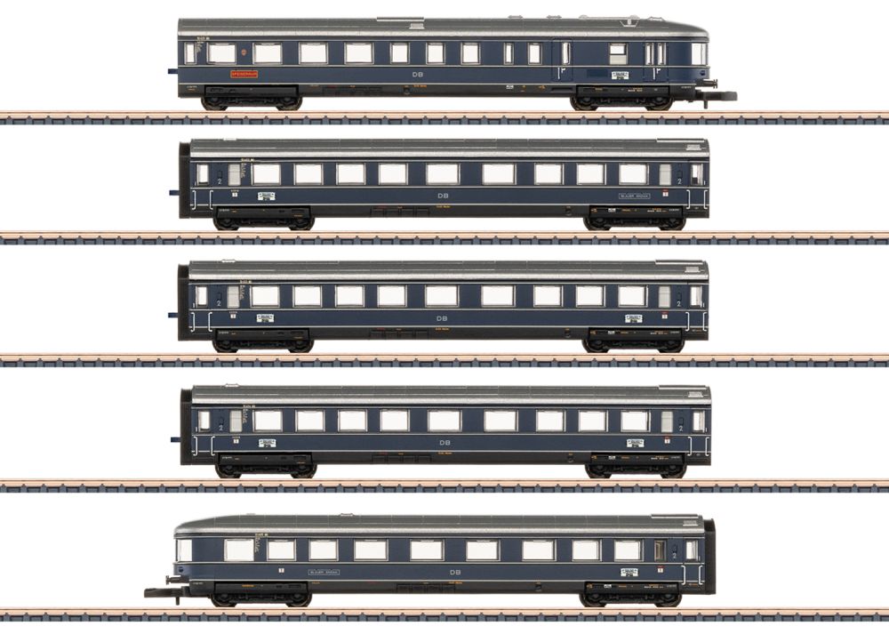 Vorbild: 5 verschiedene Schnellzugwagen unterschiedlicher Bauarten der Deutschen Bundesbahn (DB). 1 Endwagen mit Gepäckraum, Maschinenraum, Küche und Speiseraum, 3 Mittelwagen, 1./2. Klasse, 1 Endwagen, 1./2. Klasse mit Aussichtsraum. Zuglauf Hamburg - München. Betriebszustand der Epoche III.
