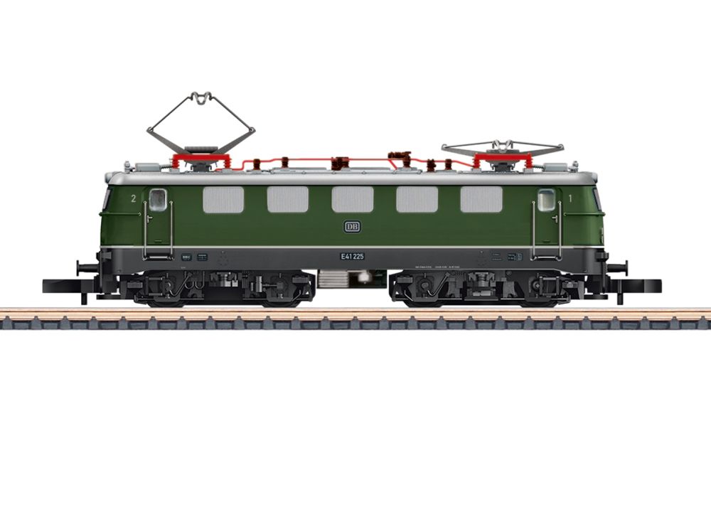 Vorbild: Elektrolokomotive E 41 der Deutschen Bundesbahn (DB) mit 5 Lampen, abgerundeten Lüftern, senkrechten Lamellen und umlaufender Regenrinne. Farbgebung chromoxidgrün. Betriebszustand September 1962.